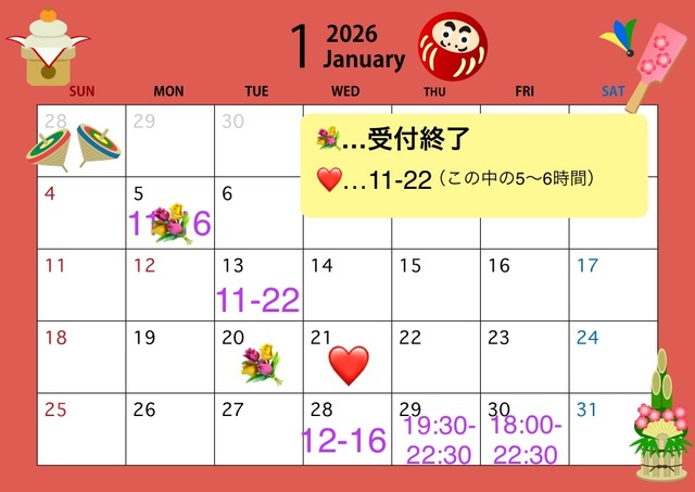 お問い合わせが無い場合はお休みに変更するかと思いますので、正式な予定は毎週末にお知らせしますね( ⸝⸝•ᴗ•⸝⸝ )੭⁾⁾